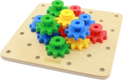 Bunte Zahnräder können auf der hölzernen Tafel verteilt oder in Form eines Turms aufgestapelt werden. Kinder können auf verschiedene Weise ein wunderschönes System erstellen. Das fördert ihre Kreativität und weckt das Interesse an Technik und Mechanismen.