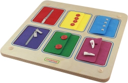 Diese hochwertige, hölzerne Lerntafel bietet Kindern einen sicheren Raum, um echte Schließmechanismen zu üben. Jede der 6 horizontalen Taschen stellt eine andere, von Jacken, Hoodies oder Hemden bekannte Schließart dar, sodass Kinder Fähigkeiten lernen, die sie jeden Tag anwenden.