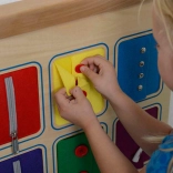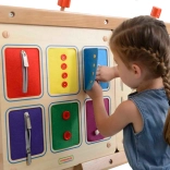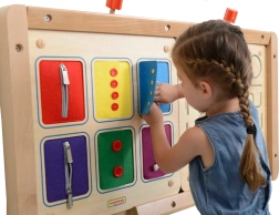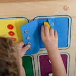 Die Tafel ist ideal für Kindergärten, Spielecken und Zuhause. Dank der robusten Holzkonstruktion, der leuchtenden Farben und Texturen regt sie zum Entdecken an, trainiert Geduld und stärkt die Selbstversorgung.