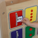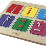 Sechs Textilpaneele imitieren realistisch das Schließen von Jacken und Hemden. Kinder üben sicher Reißverschlüsse, Knöpfe und Druckknöpfe, bevor sie sie im echten Leben anwenden.