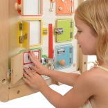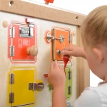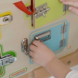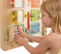 Diese robuste Holztafel bietet 6 verschiedene Türen und Schlossmechanismen – von einfachen Riegeln bis zu komplexeren Haken und Vorhängern. Kinder trainieren spielerisch Geduld, Fingerfertigkeit und Problemlösung. Jedes Öffnen einer Tür belohnt mit Platz zum Verstecken kleiner Gegenstände oder Kärtchen.