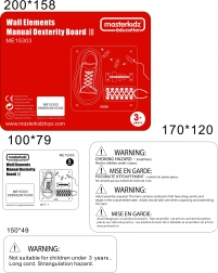 Ebenso enthalten ist das Durchfädeln einer roten Schnur durch drei Öffnungen mit unterschiedlichem Durchmesser – je kleiner die Öffnung, desto größer die Herausforderung und desto größer die Freude am Erfolg. Die Tafel kann in einem speziellen Rahmen an der Wand oder frei auf dem Tisch bzw. Boden verwendet werden und passt somit ins Kinderzimmer, in die Kita oder in den Spielbereich.