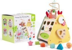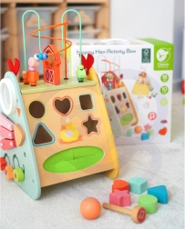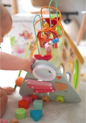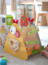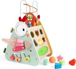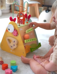 Xylophon, Labyrinth, Perlen, Zahnräder, Sortierer und weitere clevere Elemente fesseln Kinder stundenlang und fördern spielerisches Lernen.