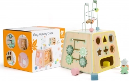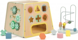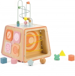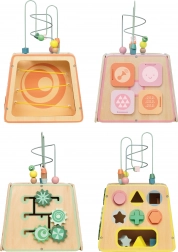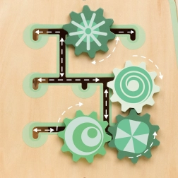 Perlenlabyrinth, Zahnräder, Schieberegler und Formensortierer fesseln die Aufmerksamkeit der Kinder und unterstützen Konzentration und logisches Denken.