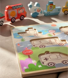 Dieses hölzerne Montessori-Einlegepuzzle bringt Kindern spielerisches Lernen. Das Set besteht aus einer robusten Platte mit Aussparungen und 7 Fahrzeug-Teilen (z. B. Auto, Taxi, Polizei, Krankenwagen, Feuerwehr, Flugzeug, Schiff), die Kinder nach Form und Bild zuordnen. Dank klarer Farben und übersichtlicher Konturen verstehen Kinder das Zuordnungsprinzip schnell und erleben mit jedem richtig eingesetzten Teil ein Erfolgserlebnis.
