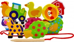 Schnur; Holzteile mit Löchern: z. B. Kuh, Traktor, Scheune, Pferd, Schaf, Zaun, Henne, Hahn, Heuballen u. a.