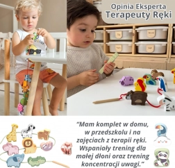 Das Durchfädeln der Schnur durch die Öffnungen in den Klötzchen trainiert Fingerpräzision, Griff und Hand-Auge-Koordination – ideal für Kinder ab 2 Jahren.