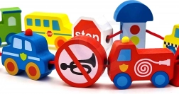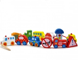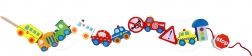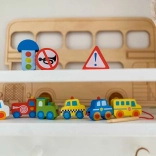 Die bunten Holzelemente stellen Autos, Bus, Traktor, Rettungswagen sowie Verkehrszeichen dar – Kinder lernen spielerisch die Welt des Verkehrs kennen.