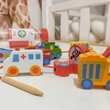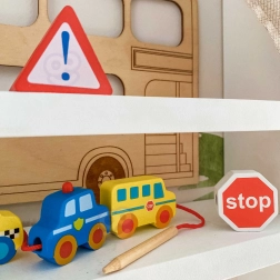 Im Set enthalten sind 12 Holzklötzchen mit Fahrzeugmotiven und 1 Schnur mit Holzstäbchen zum einfachen Durchfädeln. Durch das Auffädeln der Elemente lassen sich eigene „Kolonnen“ oder Stadtgeschichten erstellen – vom Feuerwehrauto über das Polizeifahrzeug bis hin zu Bus und Verkehrszeichen.