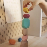 Bunte, unregelmäßige Formen fördern Geduld, Konzentration und Feinmotorik. Beim Turmbauen werden Gleichgewicht und räumliches Vorstellungsvermögen trainiert.
