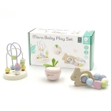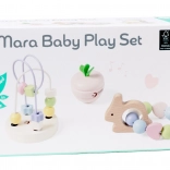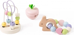 Das pastellfarbene Set motivierender Babyspielzeuge von Classic World wurde entworfen, um Freude zu bereiten und die Sinne Ihres Kindes bereits ab den ersten Tagen zu stimulieren. Dieses Holz-Set enthält mehrere wunderschöne Elemente, die Kindern helfen, Motorik und Konzentration zu entwickeln. Der fröhliche Hase ist eine Rassel mit Perlen, die mit ihrem farbenfrohen Design und melodischen Klängen begeistert. Das Schütteln dieses Spielzeugs weckt die Neugier der Kinder und unterstützt die Entwicklung des Hörsinns. Das Perlenlabyrinth ist ein weiterer Bestandteil des Sets, bei dem Kinder die Perlen drehen und schieben können, wodurch Konzentration und motorische Fähigkeiten gefördert werden. Die Spielzeuge in diesem Set haben eine sanfte Textur und pastellige Farben – angenehm für Kinder und Eltern.