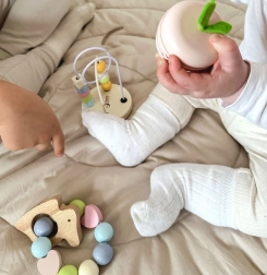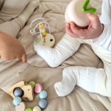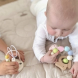 Das farbenfrohe Häschen, gefüllt mit Perlen, zieht die Aufmerksamkeit der Kinder auf sich und fördert ihr Hörvermögen. Ideal, um Greiffähigkeiten zu trainieren.