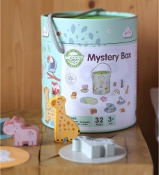 Bei dem Spiel Geheimnisvolle Kiste wählen Kinder eine der 15 Karten und erraten durch Berührung, welche Figur sich in der Kiste versteckt – dabei lernen sie, ihre Form zu erkennen. Das Spiel entwickelt den Tastsinn, die Feinmotorik und die Konzentration. Das Set bietet verschiedene kreative Spielmöglichkeiten, wie Paarbildung, Farbenlernen, Tiernamen und Turmbau.