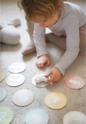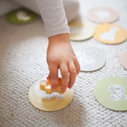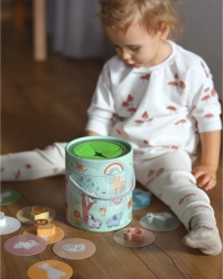 Das Set ermöglicht verschiedene Möglichkeiten des Spielens, einschließlich Paarbildung, Farbenlernen, Tiernamen und dem Bau von Türmen.
