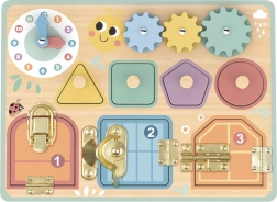Die Tafel enthält interaktive Zahnräder, die Kinder drehen können, was zur Entwicklung der Feinmotorik und Wahrnehmung von Licht und Schatten beiträgt. Ein weiteres Feature ist der Satz von Formteilen in lebhaften Farben, der das Erkennen von Formen und logisches Denken unterstützt.