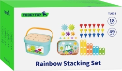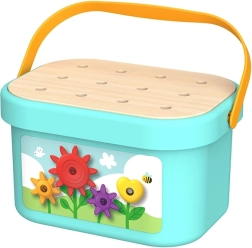 Der Inhalt des Sets umfasst eine Box mit einem Holzdeckel mit Vertiefungen, die als stabile Basis für das Stapeln der Stifte dient. Darüber hinaus beinhaltet das Set hölzerne Balken und Zahnräder, die es ermöglichen, unterschiedliche Konstruktionen zu erstellen, indem sie gestapelt oder zu komplexeren Mustern kombiniert werden.