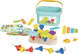 Das Set enthält außerdem 10 Muster, nach denen das Kind die Stifte anordnen oder eigene Kombinationen erstellen kann. Dies fördert die Fähigkeit, Muster und Symmetrien zu erkennen, und regt die Kreativität an. Zusätzlich bietet ein Schnur zum Auffädeln der Stifte eine weitere Spielmöglichkeit, die gleichzeitig die manuellen Fähigkeiten und die Koordination fördert.