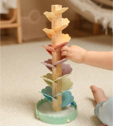 Der hölzerne Musikbaum, bekannt als Kugelbaum, verwandelt jedes Abrollen der Kugel in ein beruhigendes Konzert. Die farbenfrohen „Blätter“ bilden die Bahn, auf der die Kugeln hinabrollen und bei jeder Berührung angenehme, sanfte Töne erzeugen. Das Spielzeug fördert Konzentration, Geduld und natürliche Neugier.