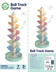 Robuste Holzkonstruktion, glatte Kanten und ungiftige Farben gewährleisten Sicherheit beim Spielen. Die Montage ist schnell erledigt und die Kugelbahn sofort einsatzbereit.