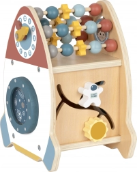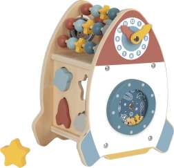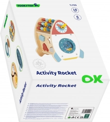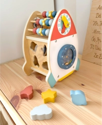 Holzrakete ist ein multifunktionales Spielzeug, das sechs verschiedene Aktivitäten zur Entwicklung der Fähigkeiten von Kindern bietet: