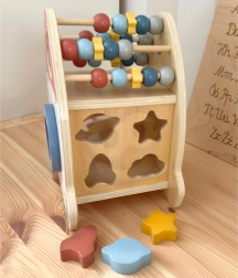 Das Spielzeug hilft, feinmotorische Fähigkeiten durch interaktive Elemente wie Perlen und Formensortierung zu entwickeln.