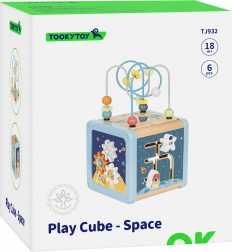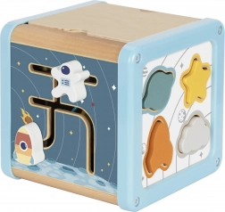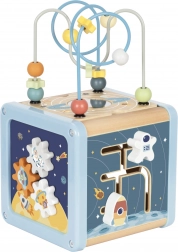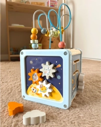 Entdecken Sie den multifunktionalen hölzernen Aktivitätswürfel mit Weltraumthema, der die natürliche Entwicklung des Kindes unterstützt. Kinder lieben es, Perlen im Labyrinth zu schieben, Bildblöcke mit Rakete, Planet und Astronaut zu drehen, Formen zu sortieren und bunte Zahnräder rotieren zu lassen. Jede Seite bietet eine andere Aktivität zur Förderung von Feinmotorik, Augen-Hand-Koordination und Neugier.