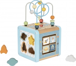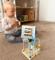 Die obere Drahtschleife mit Perlen lässt sich leicht in den Würfel versenken, sodass das Spielzeug bequem aufbewahrt und transportiert werden kann. Robuste Holzausführung und sanfte Pastellfarben passen in jedes Kinderzimmer und machen den Würfel zu einem tollen Geschenk.
