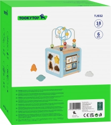 Bunte Perlen auf Metalldrähten fördern die Augen-Hand-Koordination und Geduld. Den oberen Teil mit dem Labyrinth können Sie zum einfachen Verstauen in den Würfel schieben.