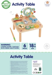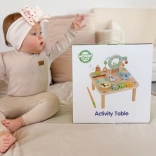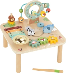 Entdecken Sie einen hochwertigen hölzernen Activity-Tisch, der Kinder auf natürliche Weise zum Entdecken anregt. Dank verschiedener Spielzonen – vom musikalischen Xylophon über Zahnräder bis zum Kugel-Labyrinth – trainieren Kinder ihre Koordination, Bewegungsgenauigkeit sowie das Verständnis von Ursache und Wirkung. Die robuste Holzkonstruktion und die zarten Pastellfarben passen perfekt ins Kinderzimmer.