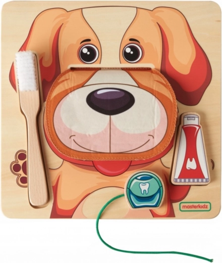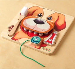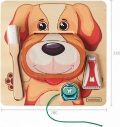 Bringen Sie Kindern gesunde Gewohnheiten auf spielerische Weise näher. Die Tafel mit Hündchen-Motiv hat ein öffnendes Maul und 10 realistisch dargestellte Zähne, die kleine Zahnärztinnen und Zahnärzte mit den beiliegenden Utensilien putzen können. Durch Rollenspiel eignen sich Kinder ganz natürlich richtige Putztechniken an und merken sich die tägliche Routine leichter. Im Sinne des Montessori-Ansatzes fördert das Material Selbstständigkeit, Konzentration und natürliches Lernen durch Spiel.
