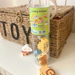 Dieses niedliche Set enthält 11 bunte Holztiere und eine fröhliche Wolke, die Kinder leicht auf die beiliegende Schnur mit Holzspitze auffädeln können. Jedes Teil hat präzise Fädelöffnungen, die Geduld und Konzentration fördern. Pastellfarben und ein ansprechendes Design regen die Fantasie an und machen Lernen zu einem natürlichen Bestandteil des Spiels.