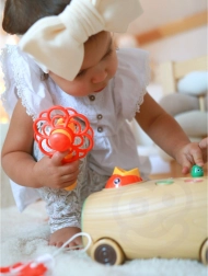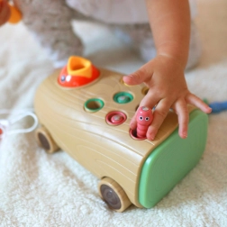 Dieses interaktive Spielzeug wächst mit dem Kind: von den ersten Schritten als Ziehwagen mit sanftem Lauf über das Klopfen der Würmchen mit einem sicheren Hammer bis zum magnetischen Angeln der versteckten Teile mit einem Vögelchen mit Magnet. Es fördert Konzentration, Geduld und die Entwicklung der sensorischen Wahrnehmung.