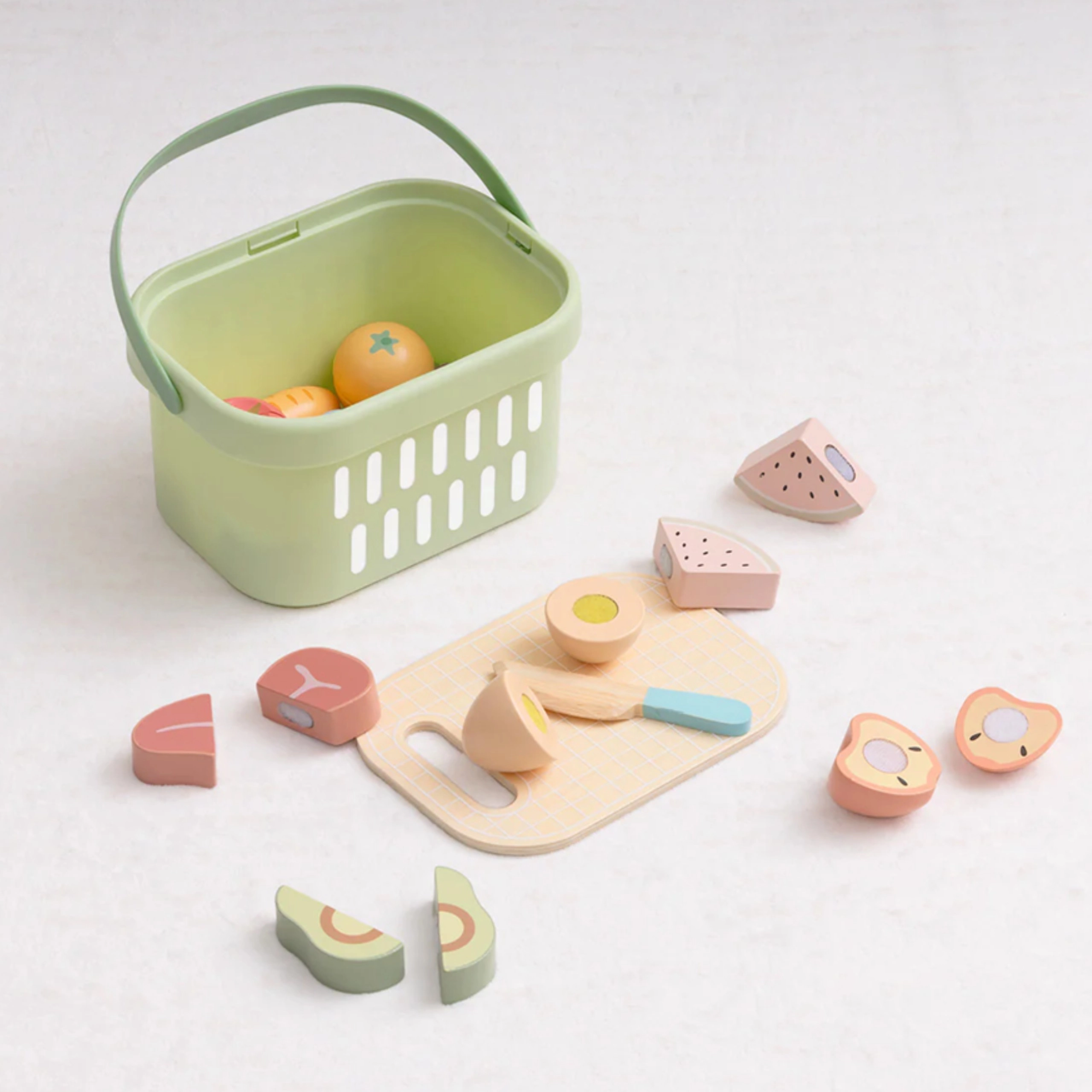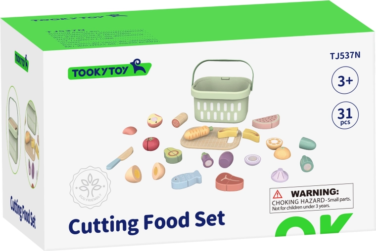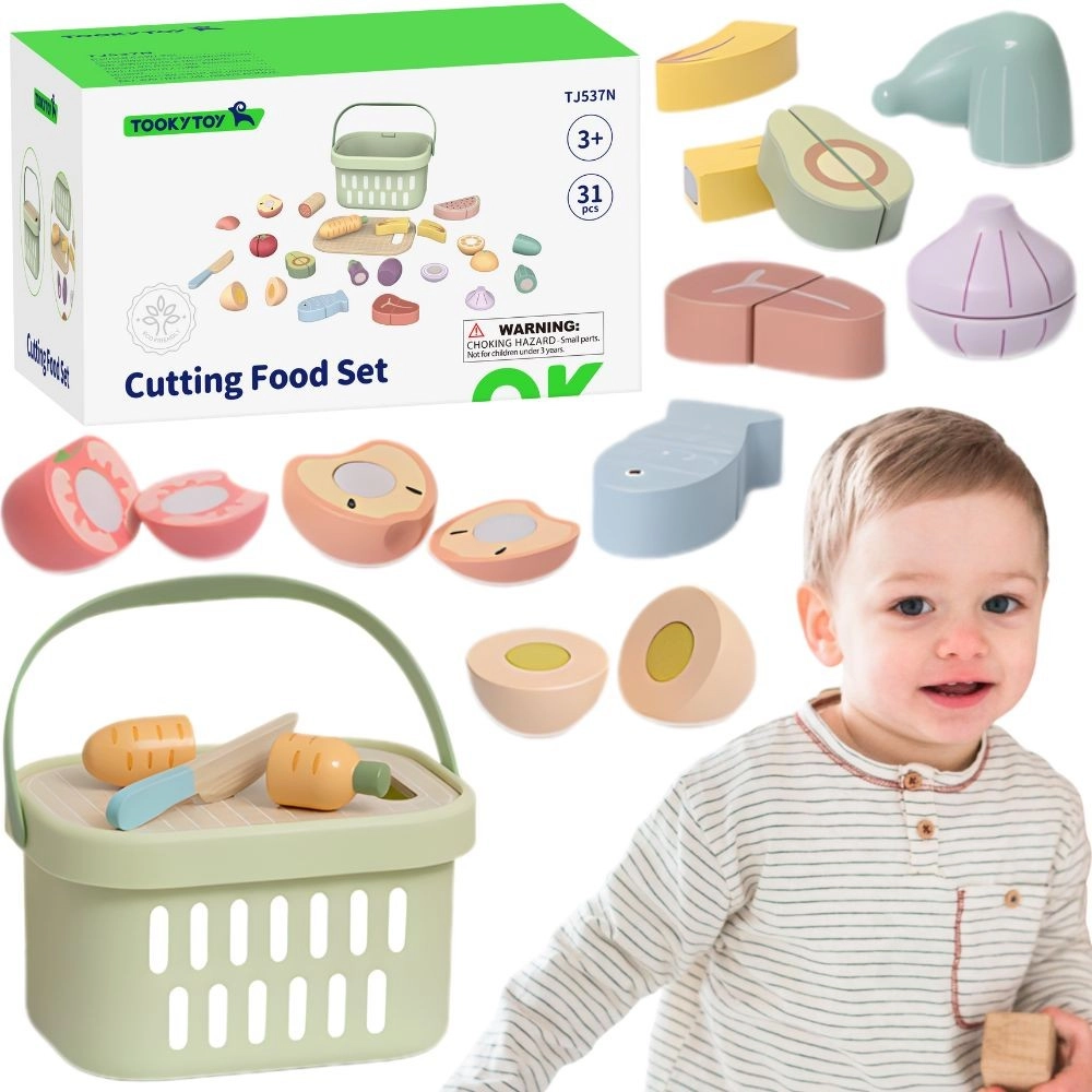 Das Holz-Lebensmittelset von TOOKY TOY ist ideal für die kleine Spielküche. Pastellfarbenes Obst und Gemüse, Fisch, Steak, Käse oder Ei sind in Teile geteilt und mit Klett verbunden – Kinder können sie mit dem Holzmesser auf dem beiliegenden Brett sicher „schneiden“ und wieder zusammenfügen. Alles kommt in den leichten Korb, so ist das Set einfach zu transportieren und stets ordentlich verstaut.