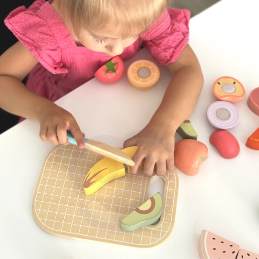Die Obst- und Gemüsestücke sind segmentiert und mit Klett verbunden. Kinder können sie mit dem Holzmesser auf dem Brett immer wieder „schneiden“ und neu zusammensetzen.