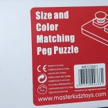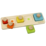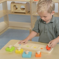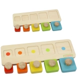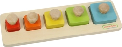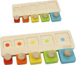 Von der Montessori-Methode inspiriertes Holzspielzeug ist ideal zur Entwicklung von Feinmotorik, sensorischen Fähigkeiten und Hand-Auge-Koordination bei Kindern. Es besteht aus fünf quadratischen Blöcken in verschiedenen Farben und Größen, die das Kind in die entsprechenden Stellen auf der zweiseitigen Grundlage einsetzt: eine Seite hat farbige Punkte für einfacheres Zuordnen, die andere Seite nur ausgeschnittene Öffnungen zur Erhöhung des Schwierigkeitsgrades.
