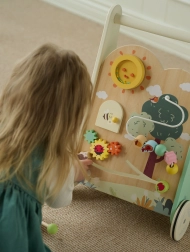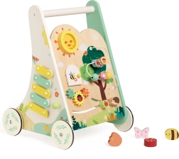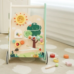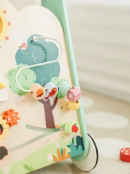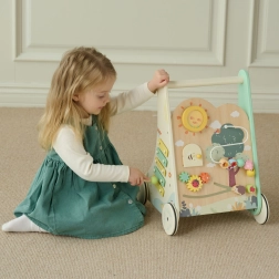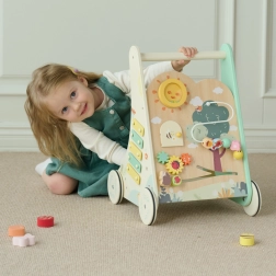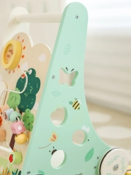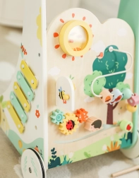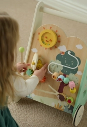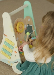 Der Lauflernwagen wächst mit dem Kind mit: von der Gehhilfe bis zum eigenständigen Spiel mit Aktivitäten, die Feinmotorik, Koordination, Gehör und logisches Denken fördern. Die Oberflächen sind mit gesundheitlich unbedenklichen Farben in sanften, ansprechenden Tönen behandelt.