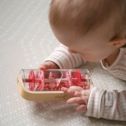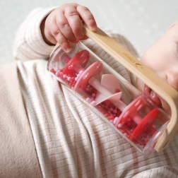 Dieser rote Regenstab kombiniert natürliches Holz mit einem transparenten Korpus voller Kügelchen, die beim Bewegen sanft rieseln und ein entspannendes, rhythmisches Geräusch erzeugen. Kinder können das Spielzeug schütteln, um 360° drehen und beobachten, wie die Perlen von oben nach unten wandern – ein großartiger Reiz für Sehen, Hören und Feinmotorik.