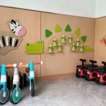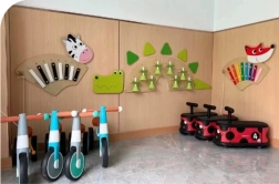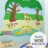 Das Wanddesign spart Platz und schafft eine attraktive Zone für gemeinsames Spiel und musikalische Förderung.
