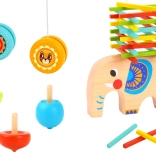 Dieses farbenfrohe 46-teilige Holz-Spieleset vereint mehrere beliebte Spiele in einem Paket. Kinder können Stäbchen auf dem Rücken des Elefanten balancieren, einen Turm oder einen Brunnen bauen, Mikado spielen, Tricks mit zwei Jo-Jos üben und messen, wessen Kreisel länger dreht. Ideal für das Spielen allein oder für Familienwettbewerbe.