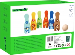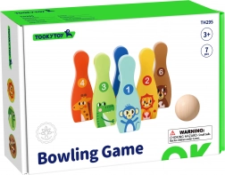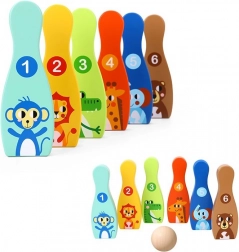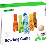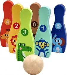 Das hölzerne Bowlingset mit sechs farbigen Kegeln und einem Ball ist ideal für das Kinderzimmer. Jeder Kegel hat ein Tiermotiv und eine Nummerierung von 1–6, wodurch Kinder beim Spiel ganz natürlich das Zählen, das Erkennen von Farben und die motorischen Fähigkeiten trainieren.