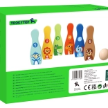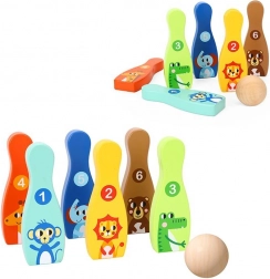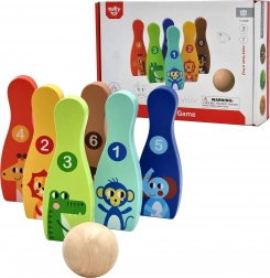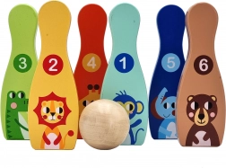 Jeder Kegel hat eine kräftige Farbe, die Zahl 1–6 und ein niedliches Tiermotiv. Kinder lernen beim Spielen ganz natürlich zu zählen sowie Farben und Formen zu erkennen.