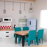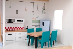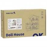 Entdecken Sie den Zauber moderner Architektur in der Kinderwelt. Das hölzerne Puppenhaus von TOOKY TOY hat 3 detailreiche Ebenen – Küche mit Essbereich und Bad im Erdgeschoss, ein geräumiges Wohnzimmer im ersten Stock und ein gemütliches Schlafzimmer mit Balkon im Dachgeschoss. Möbel und Dekorationen verleihen jedem Raum eine realistische Atmosphäre.