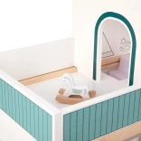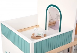 Das Haus besteht aus langlebigem FSC-zertifiziertem Holz und ist mit ungiftigen Farben in sanften Pastelltönen bemalt.