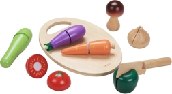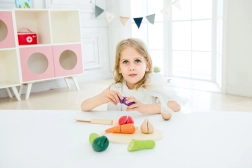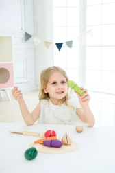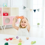 Dieses Holz-Gemüseschneideset der Marke CLASSIC WORLD ist ideal für kleine Köchinnen und Köche, die gerne die Welt der Erwachsenen nachahmen. Die Gemüsestücke sind mit Klett verbunden, sodass Kinder sie mit dem Holzmesser „schneiden“ und wieder zusammenfügen können – unterhaltsam, sicher und lehrreich.