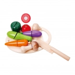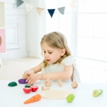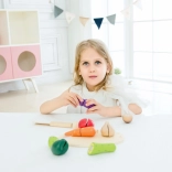 Die bunten Gemüsestücke sind mit Klett verbunden – Kinder können sie immer wieder „schneiden“ und erneut zusammenfügen, ganz ohne Verletzungsgefahr.