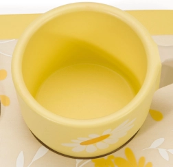 Das Set enthält einen Teller, Besteck, Becher, Salz, Pfeffer, ein Ei, Toastscheiben, eine Speckscheibe und mehr.