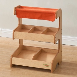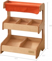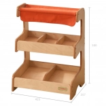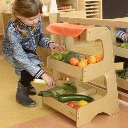 Der Holzmarktstand von Masterkidz mit Textildach bietet eine zweistöckige Konstruktion für maximale Flexibilität. Auf der ersten Ebene finden Sie drei Kammern, ideal für verschiedene Produktarten.