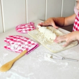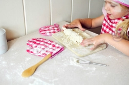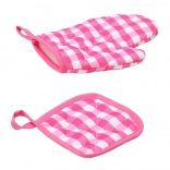 Die rosa-weiß karierten Handschuhe und die Unterlage schützen die kleinen Hände vor heißen Oberflächen, was das Kochen sicher macht.