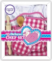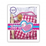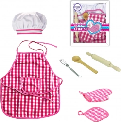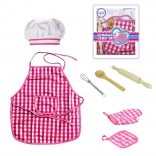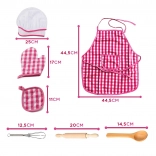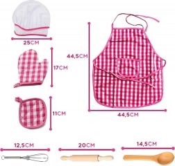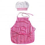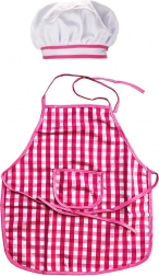 Die Schürze und Mütze mit rosa-weißem Karomuster sind die Hauptelemente, die ein stilvolles und funktionales Spielerlebnis für Kinder gewährleisten.