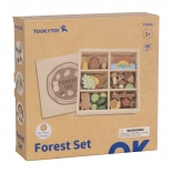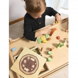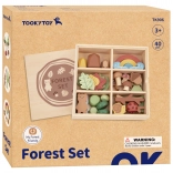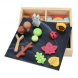 Das Set wird in einer praktischen Holzbox mit einer rückseitigen Tafel zur Kreidenutzung aufbewahrt.